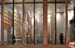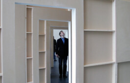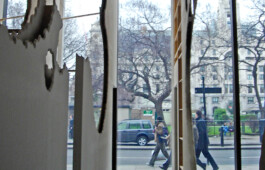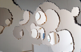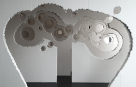 In the main gallery of the Bloomberg space, a succession of stage walls leads the spectator through the construction of a perspectival illusion, culminating at the epicenter of a formalized cosmic explosion of matter. Standing in the core of the blast, the multitude of holes ascending upwards evoke the splendor of a cathedral or the gaze at stars on a clear night. Loosely inspired by early twentieth-century stage designs and a desire to create a moving image, a series of cutouts suggests the soaring movement. The ever-changing incidence of light in the space and the ragged edges of the cutouts further create a sense of continuous motion.