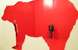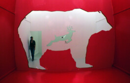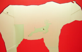 Conceived as a response to a biennial theme of a rather theoretical nature, the installation was inspired by a fundamental desire to depict the world that surrounds us. Reminiscing on the subject of cave paintings, a series of silhouetted animals are arranged through a series of connecting rooms. The installation’s forced perspective functions through the cut-out of each wall, increasing in size, so that the final, red monochrome room colors all of the preceding shapes when seen from the front. This optical play is based on the principle of stage design, as well as on so-called cut-out and pop-up books. Food Chain is a comic storyline, a primal echo, and an excision of spatial cuts.