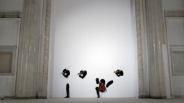Various versions exist of Murmur, whereby a number of musicians play a piece of music from within a wall. They function, as it were, as wall of the institute. The idea for Murmur arises out of ubiquitous and virtually continually self-representation within our current digital existence. The film shows the current popular cult of personality and constant administration/management of our public profile, in contrast to the invisible life of hidden and captivated/captured/imprisoned characters.